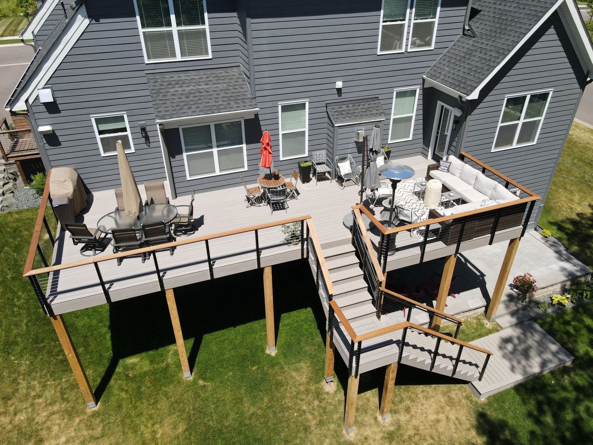 RailFX® fascia-mounted horizontal cable railing with Ipe drink rail attachment